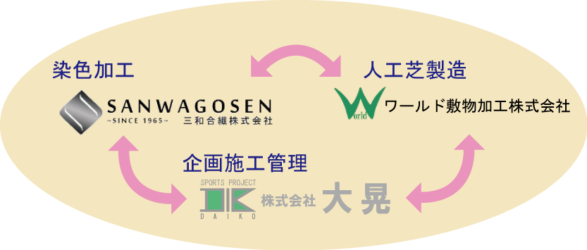 敷物加工株式会社、人工芝施工の株式会社 大晃、この三社が協力